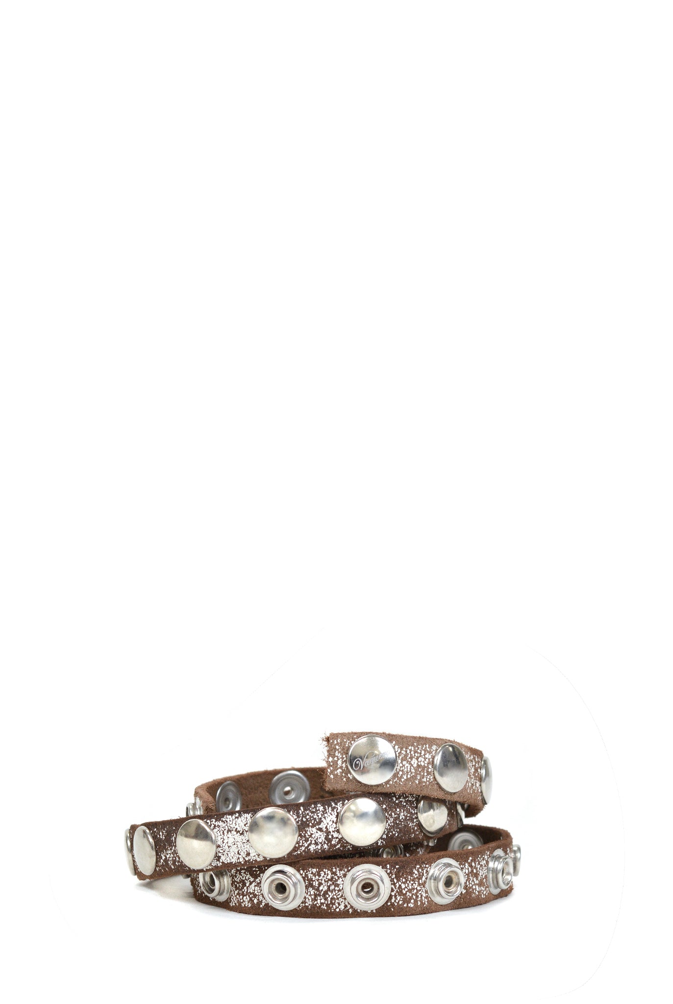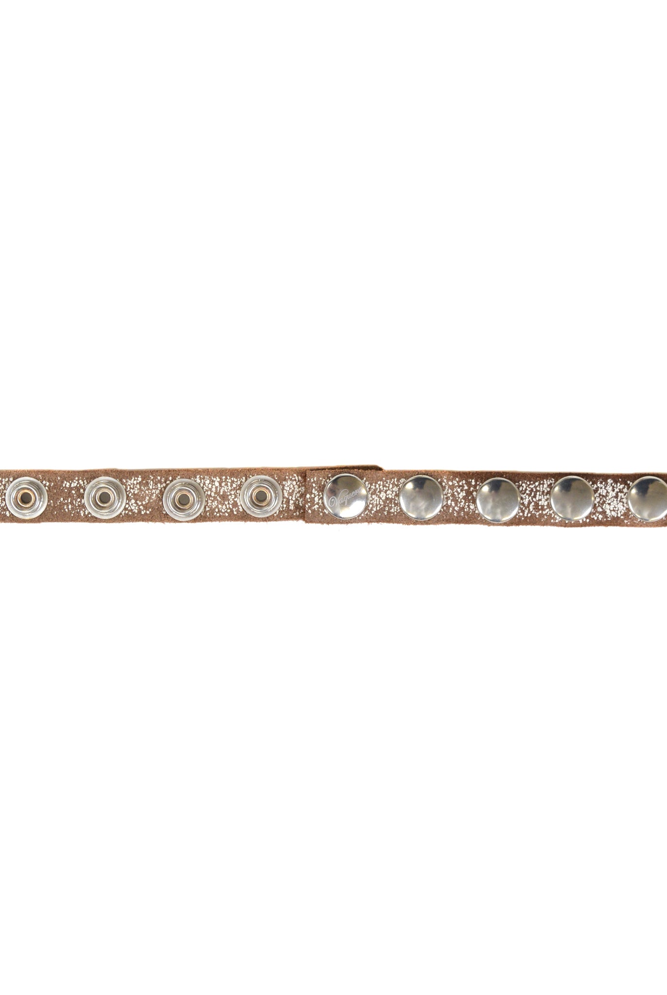 This distressed leather belt is studded in snaps tip to tip, making it fully adjustable.