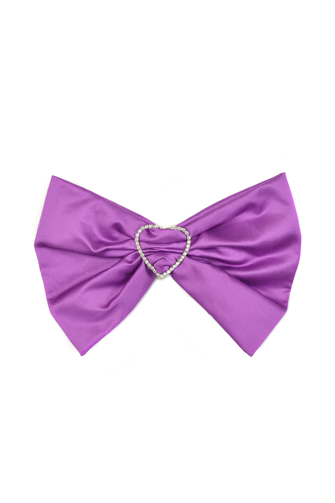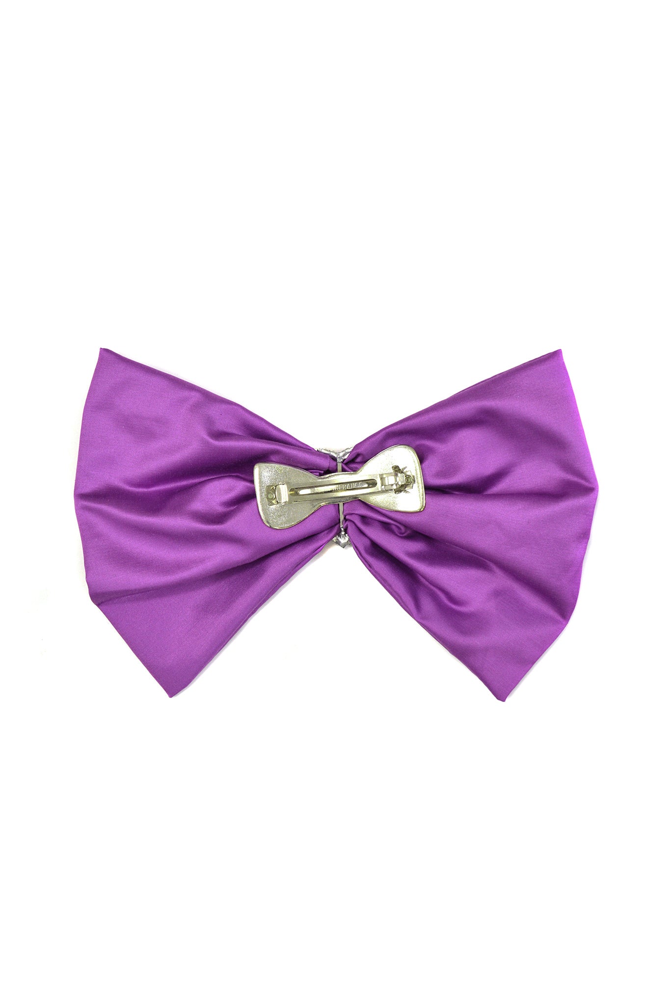 Extra large sparking purple hair bow affixed to a French barrette. A rhinestone-encrusted heart is at the centre of each bow.
