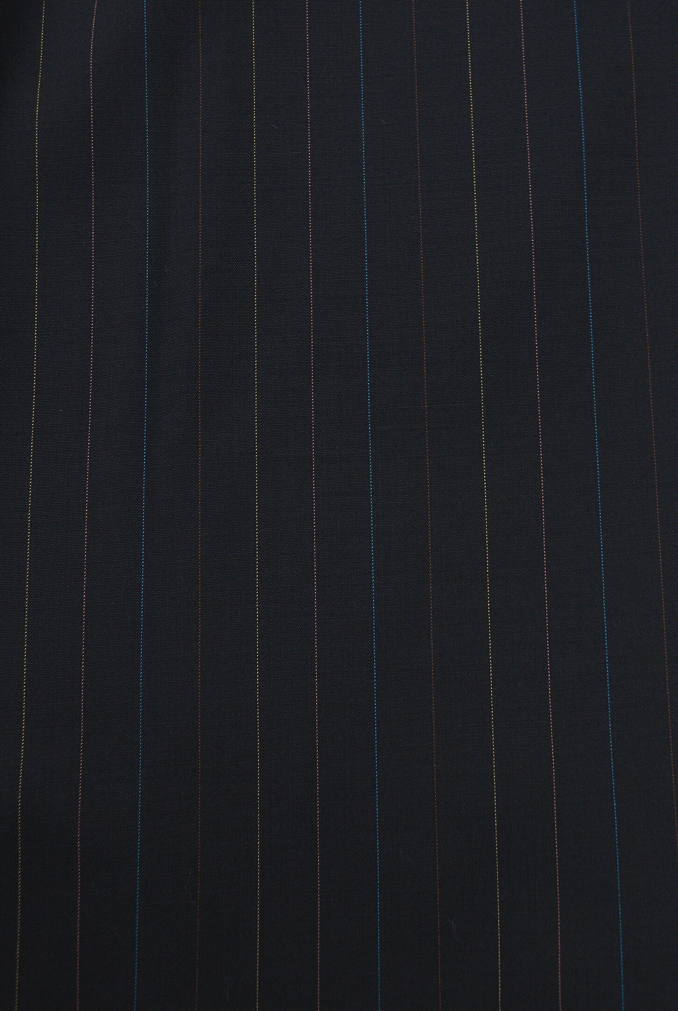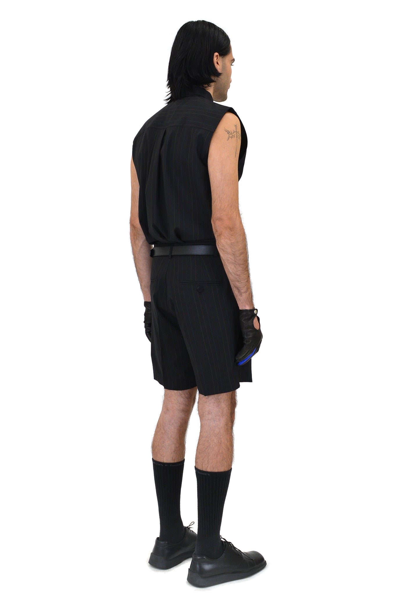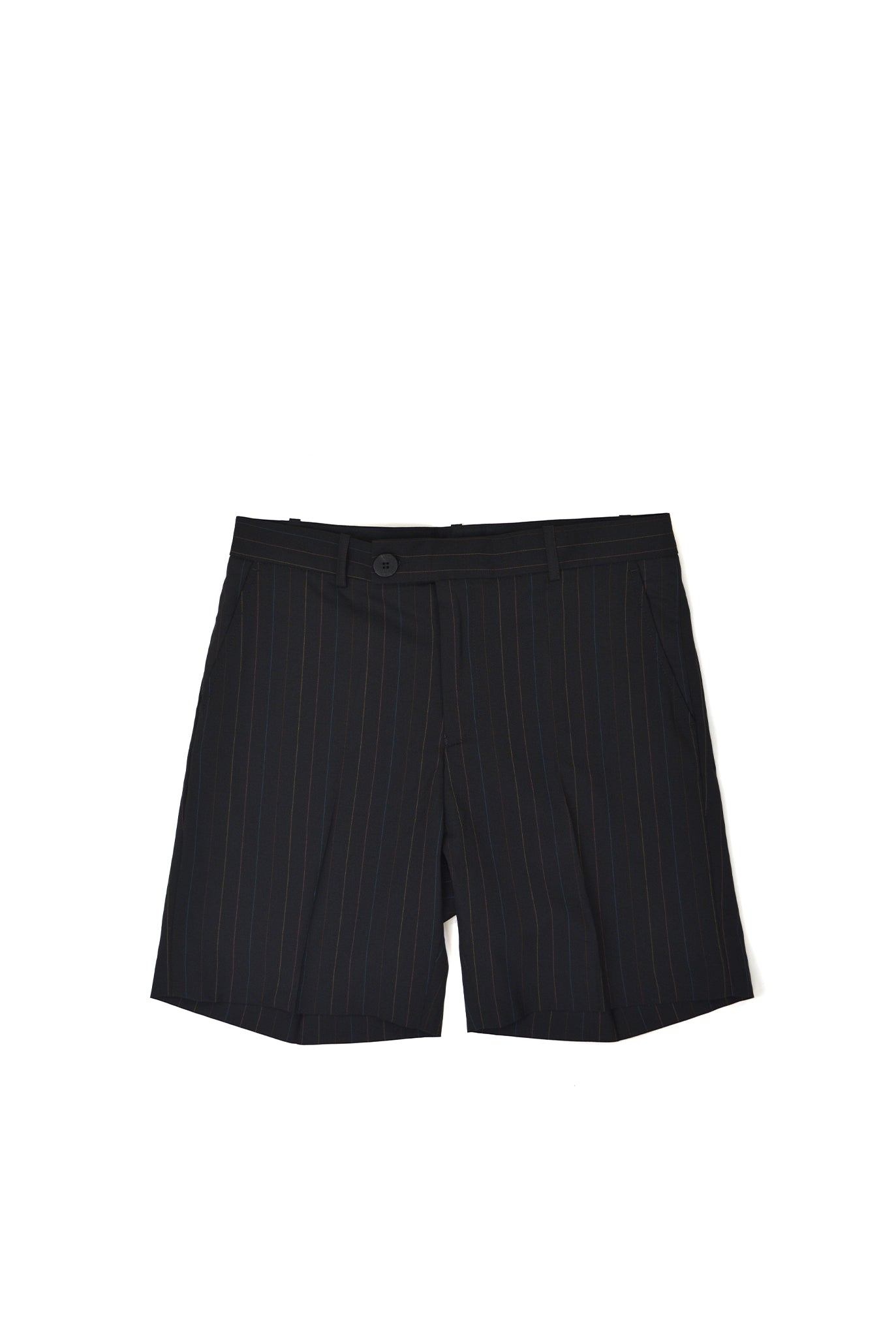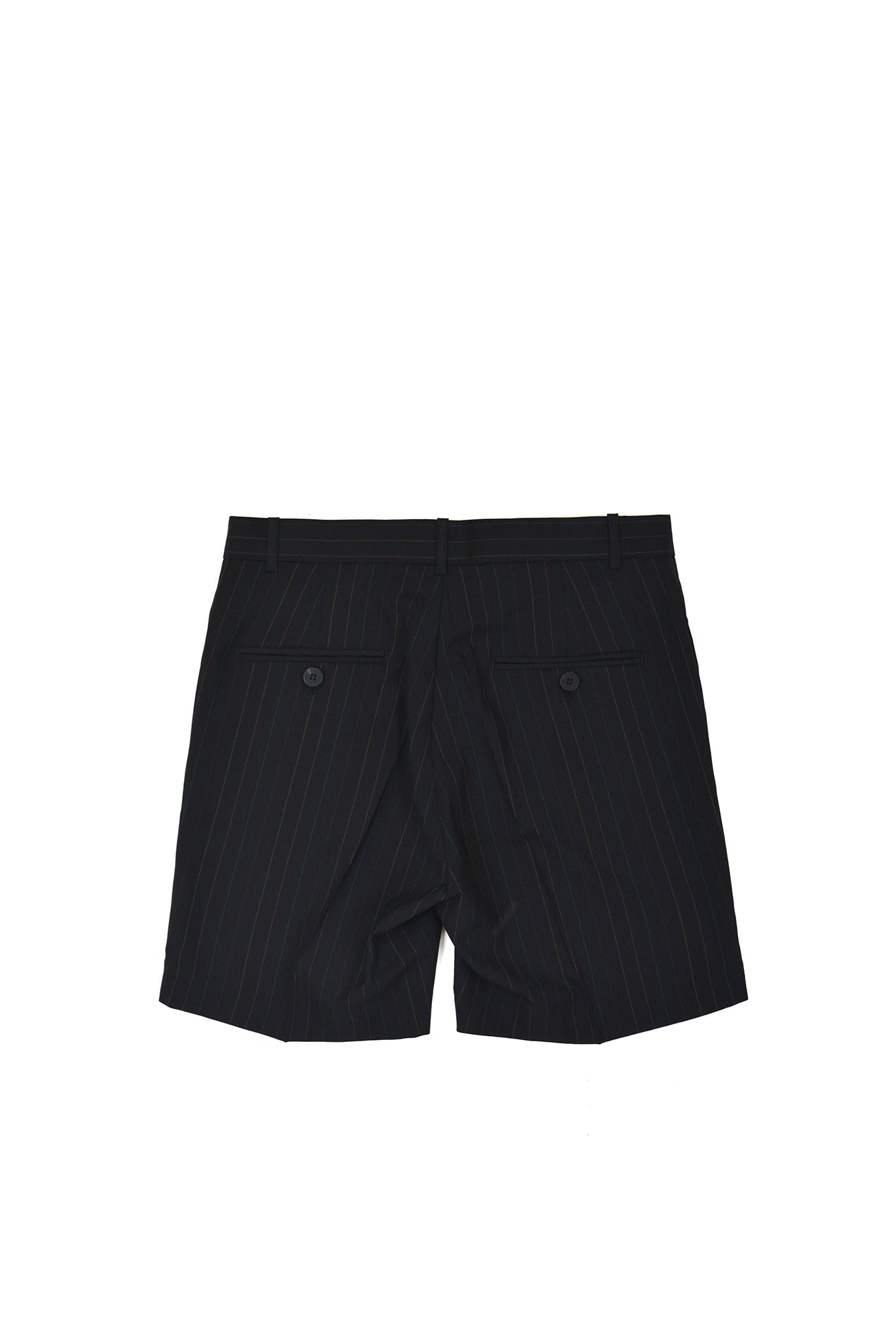 Tailored trouser shorts in a black. Multi-coloured pinstripes run throughout in shades of red, orange, yellow, and blue.