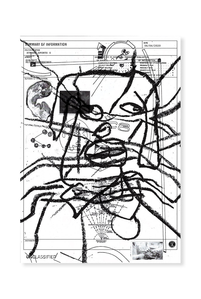 ‘AWAKENINGS REPORT’ is a dossier created by Claire Barrow and Daniel Swan featuring a 50 page B+W artwork zine focusing on extraterrestrial sightings, internet popups, conspiracy theories and clickbait, and 3 glossy art prints from Barrow’s most recent painting series in August 2020. These are held in a white stamped and sealed dossier holder. Signed and numbered editions of 100. London, UK.