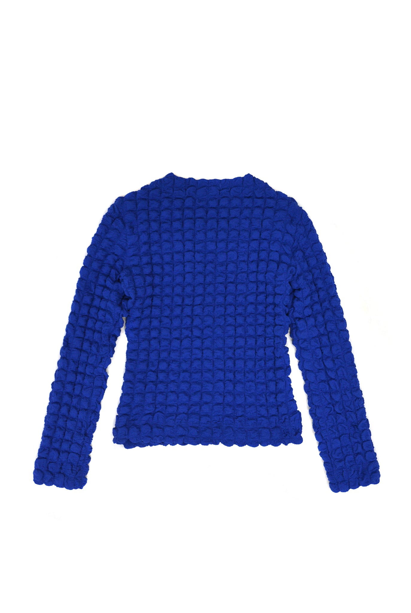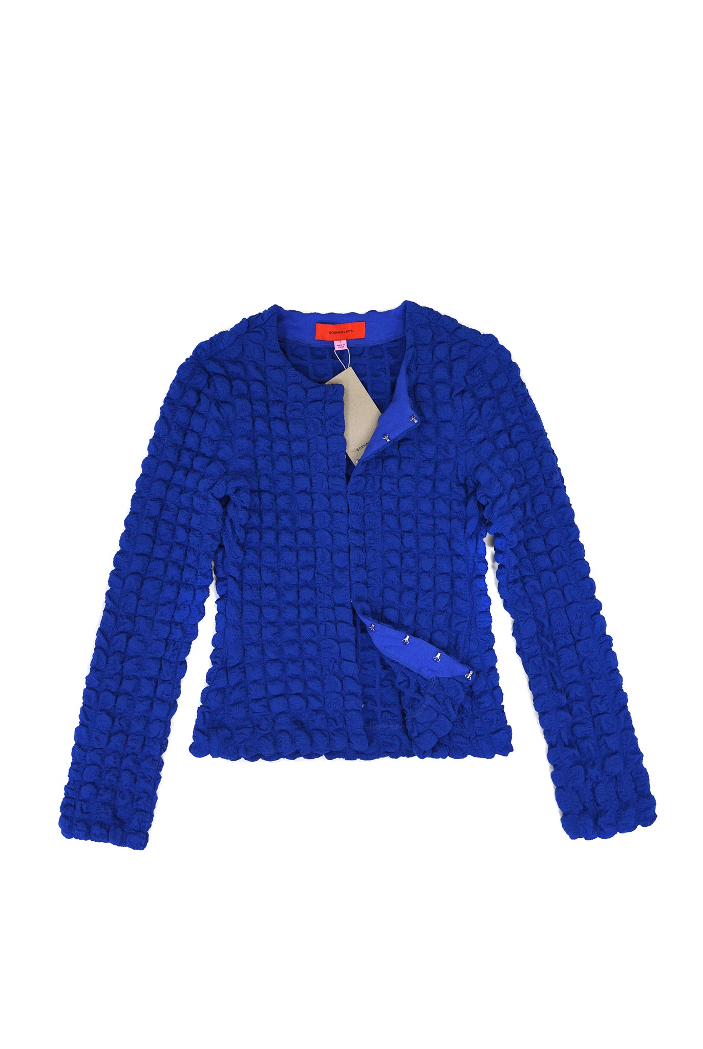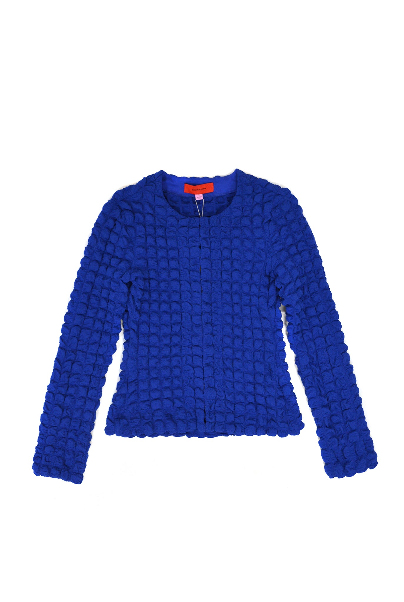 Stretchy, lightweight cobalt blue crepe cardigan. Named after bubblewrap, the fabric's special weave yields a bumpy, tactile finish.