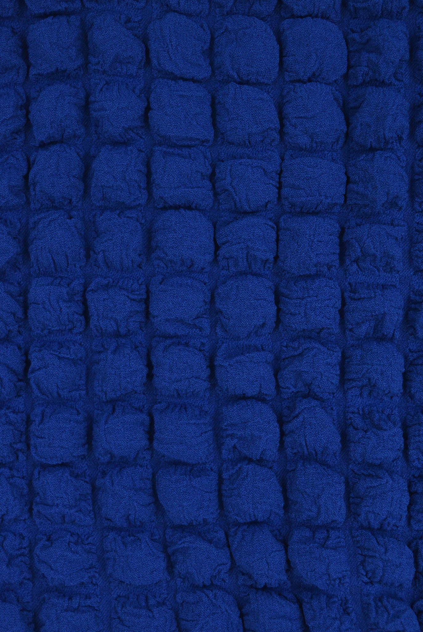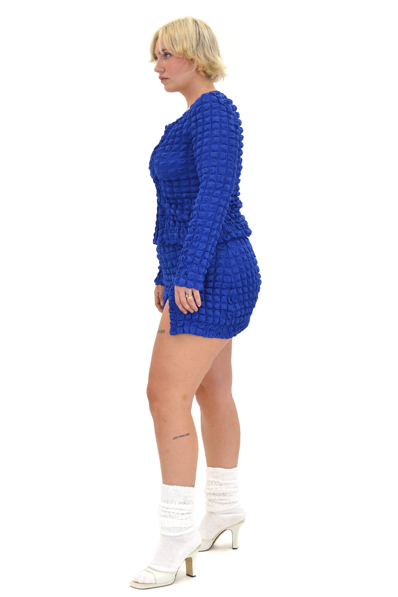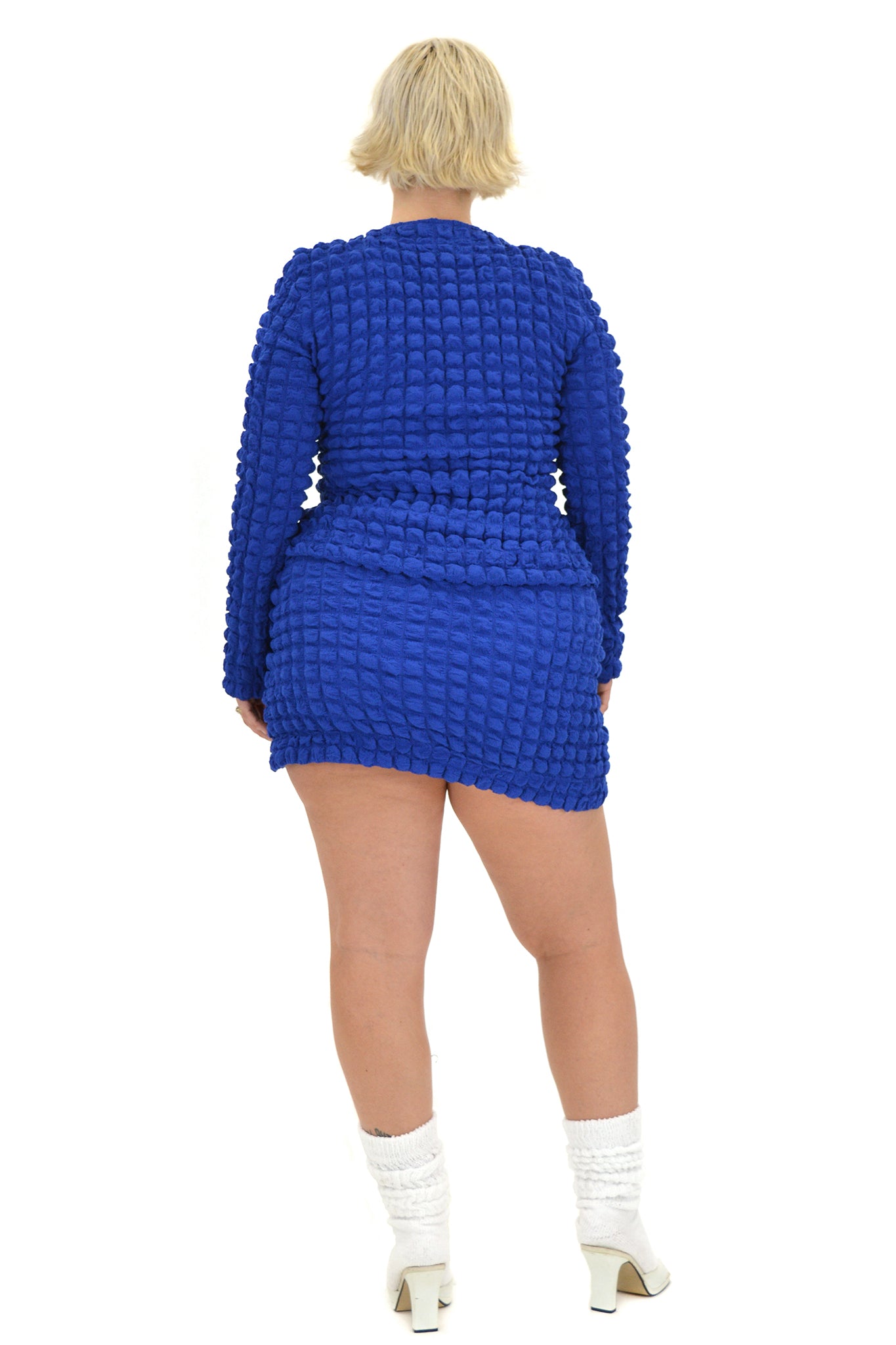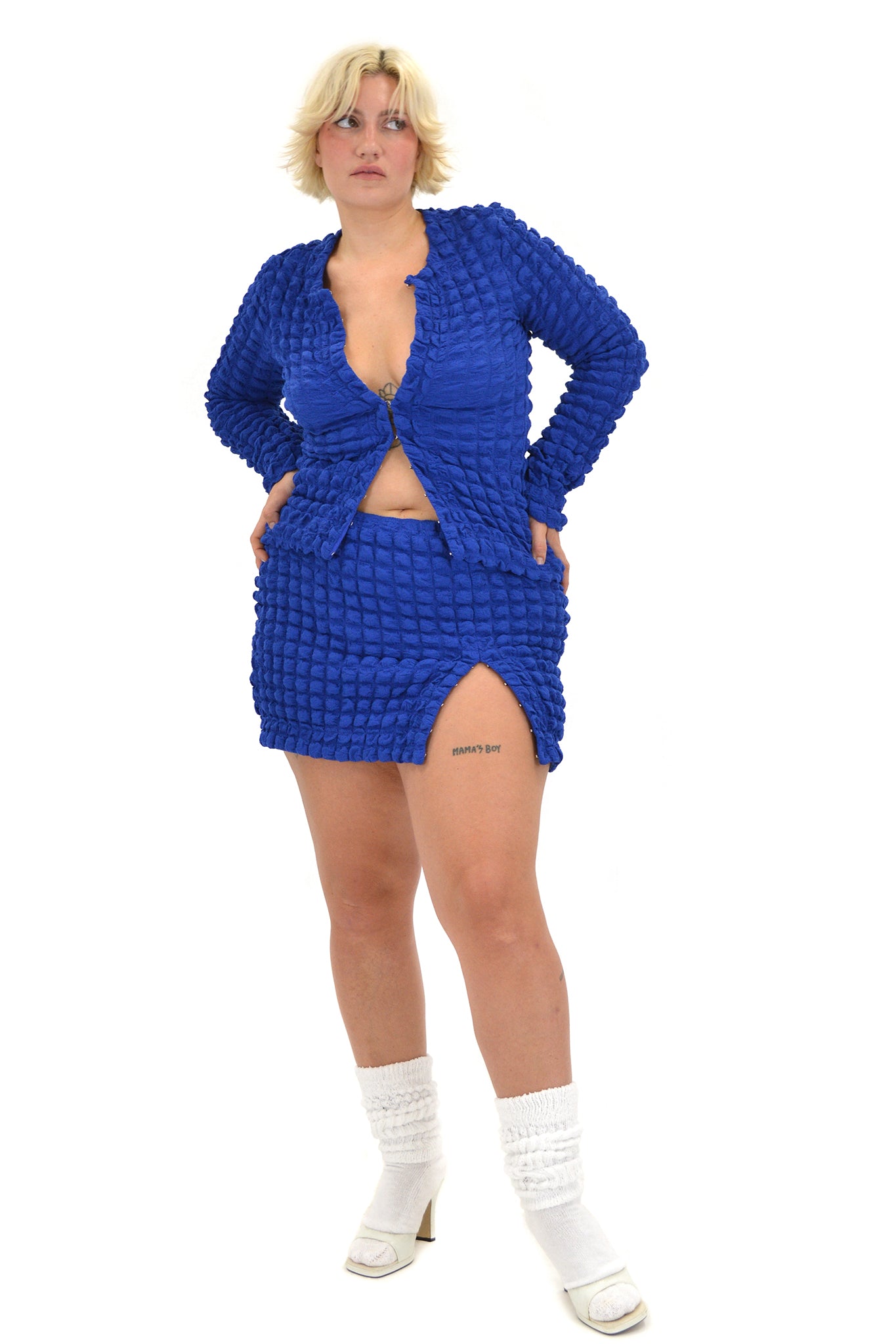 Stretchy, lightweight cobalt blue crepe cardigan. Named after bubblewrap, the fabric's special weave yields a bumpy, tactile finish.