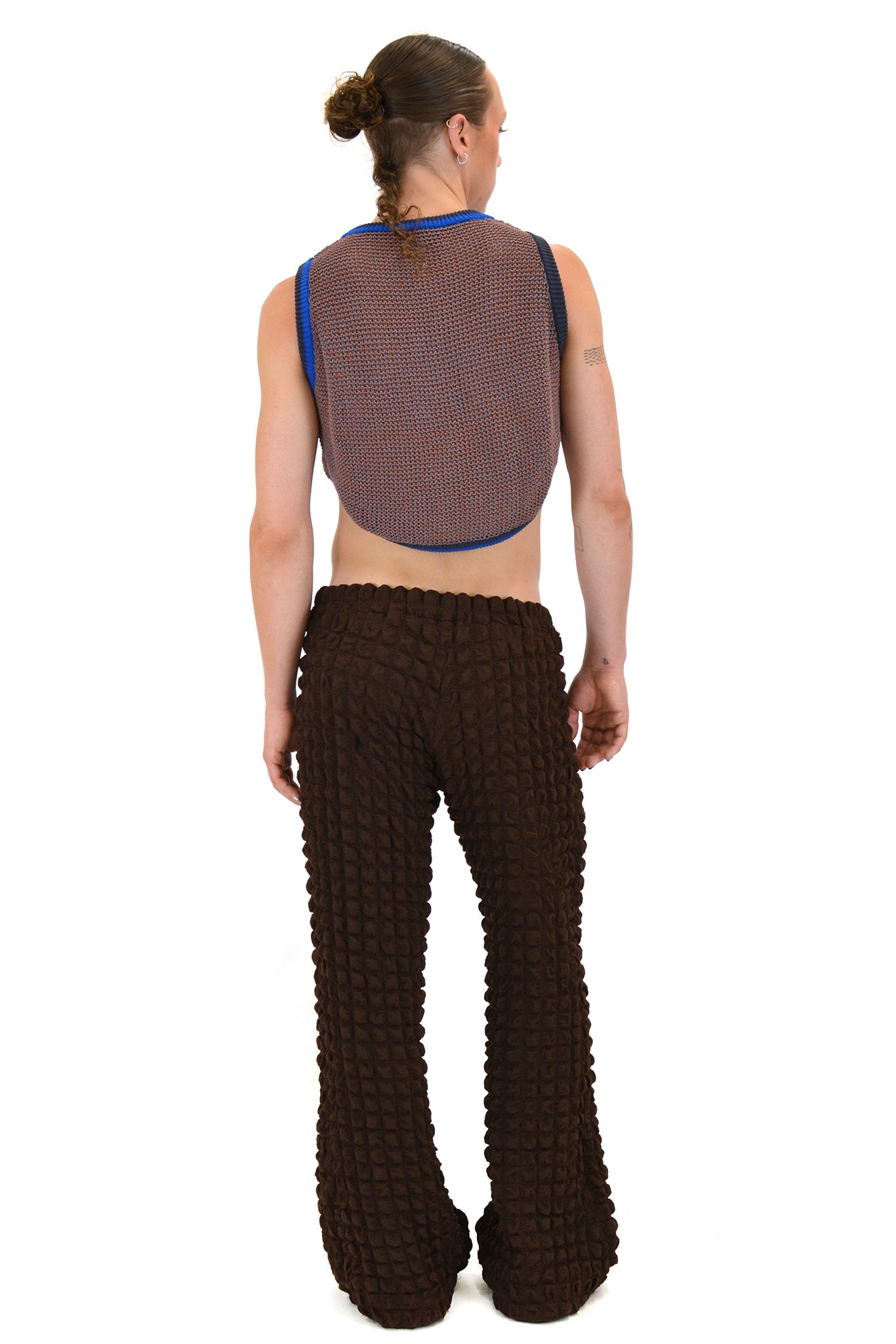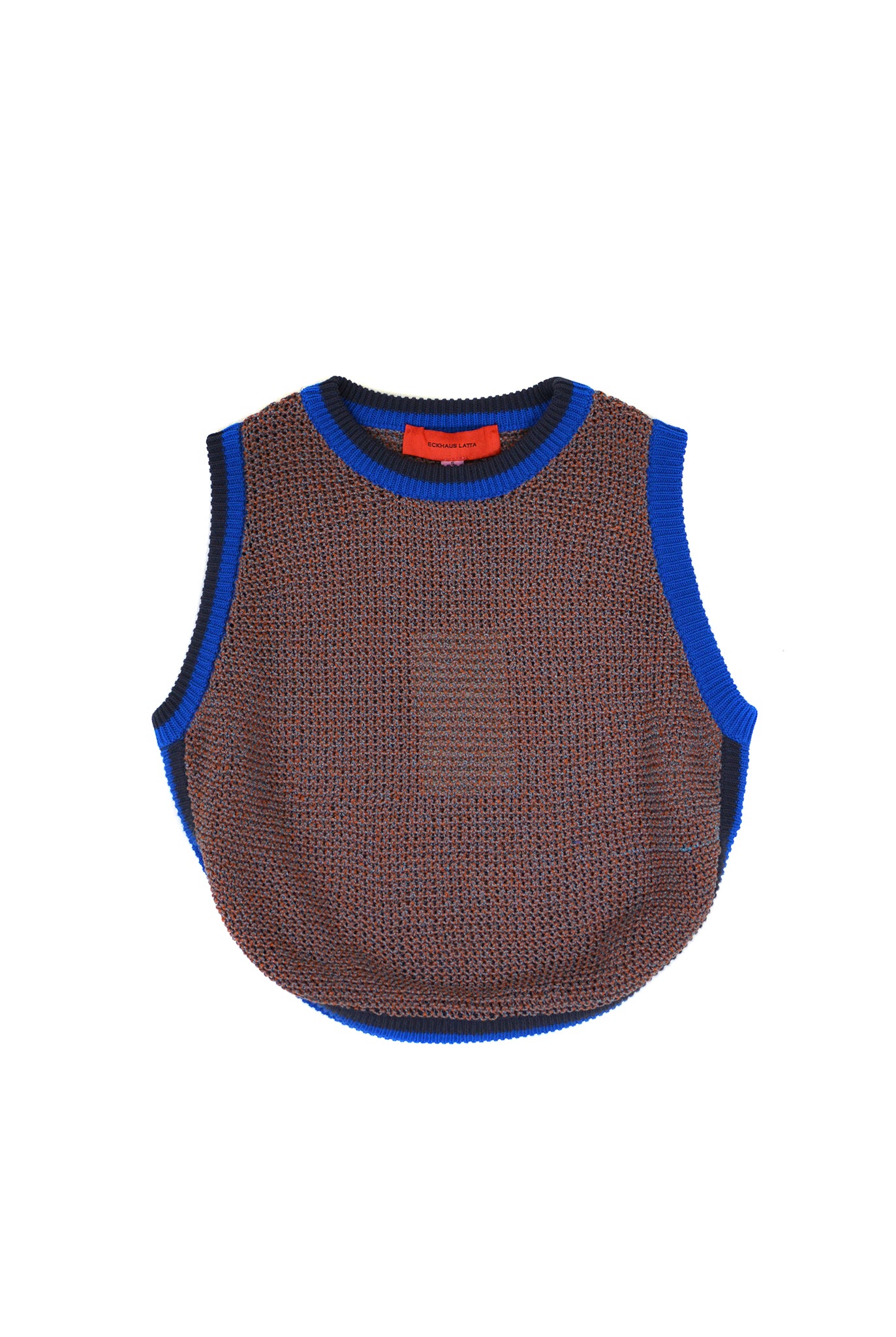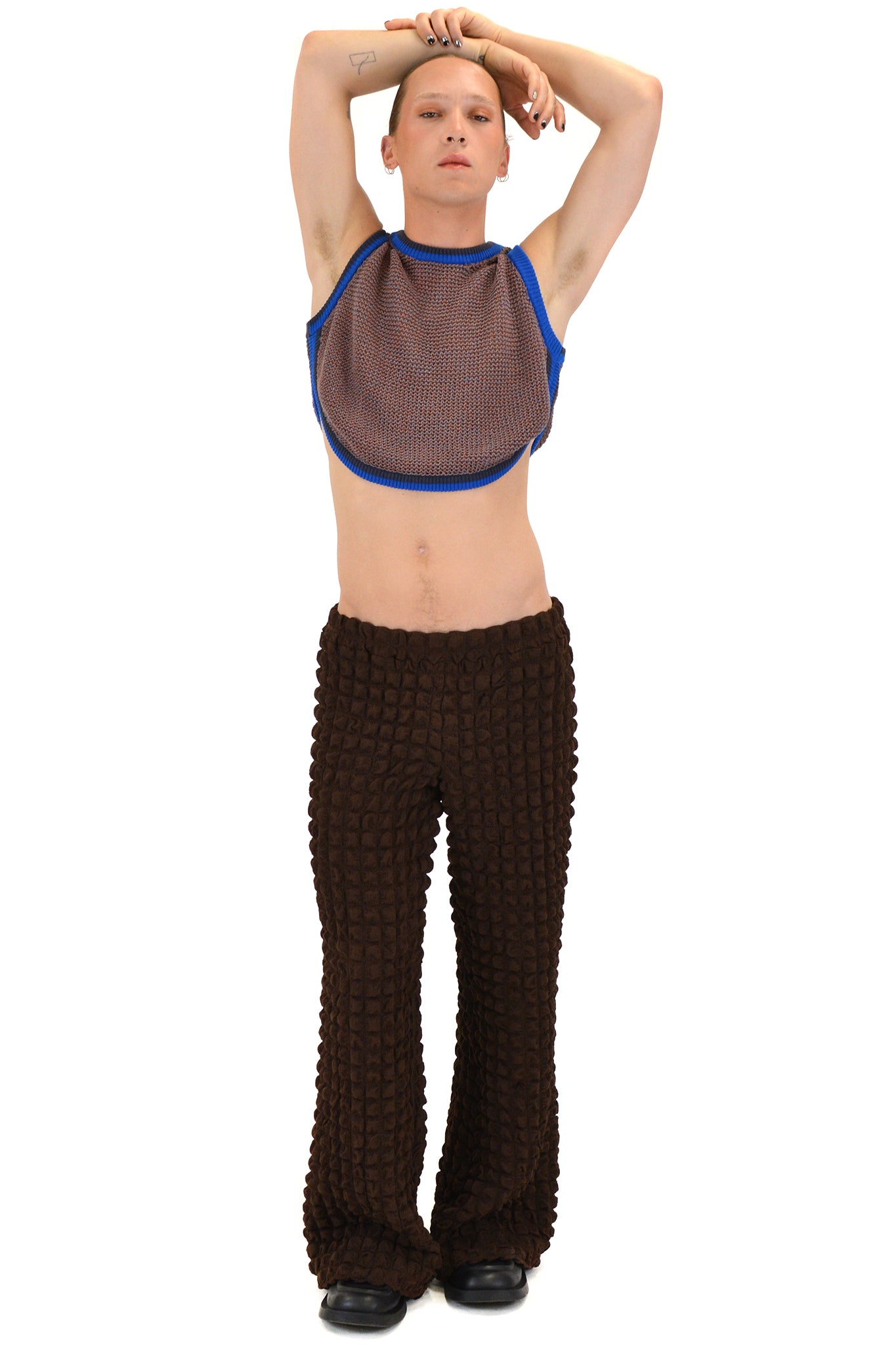 Sheer woven cropped tank top in shades of blues, greys and rust.