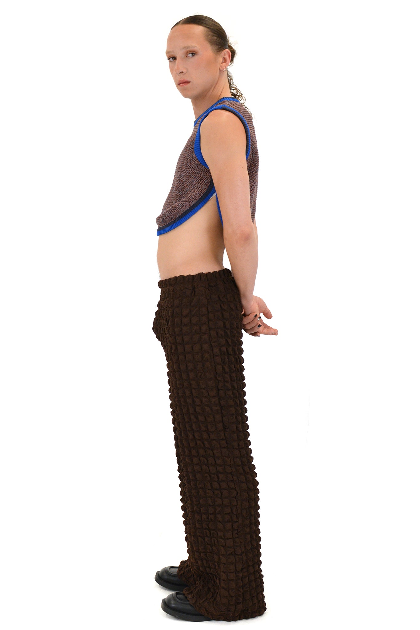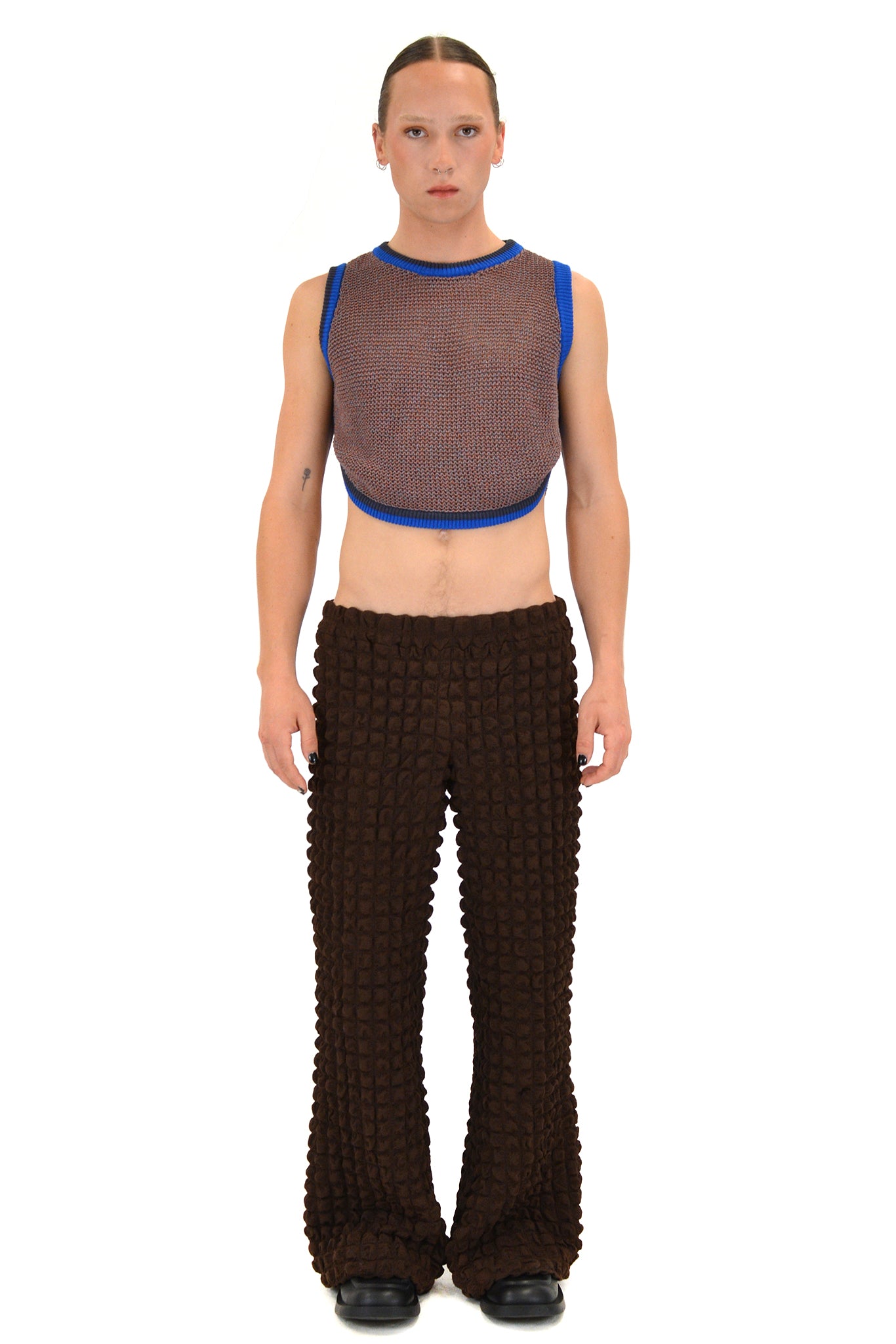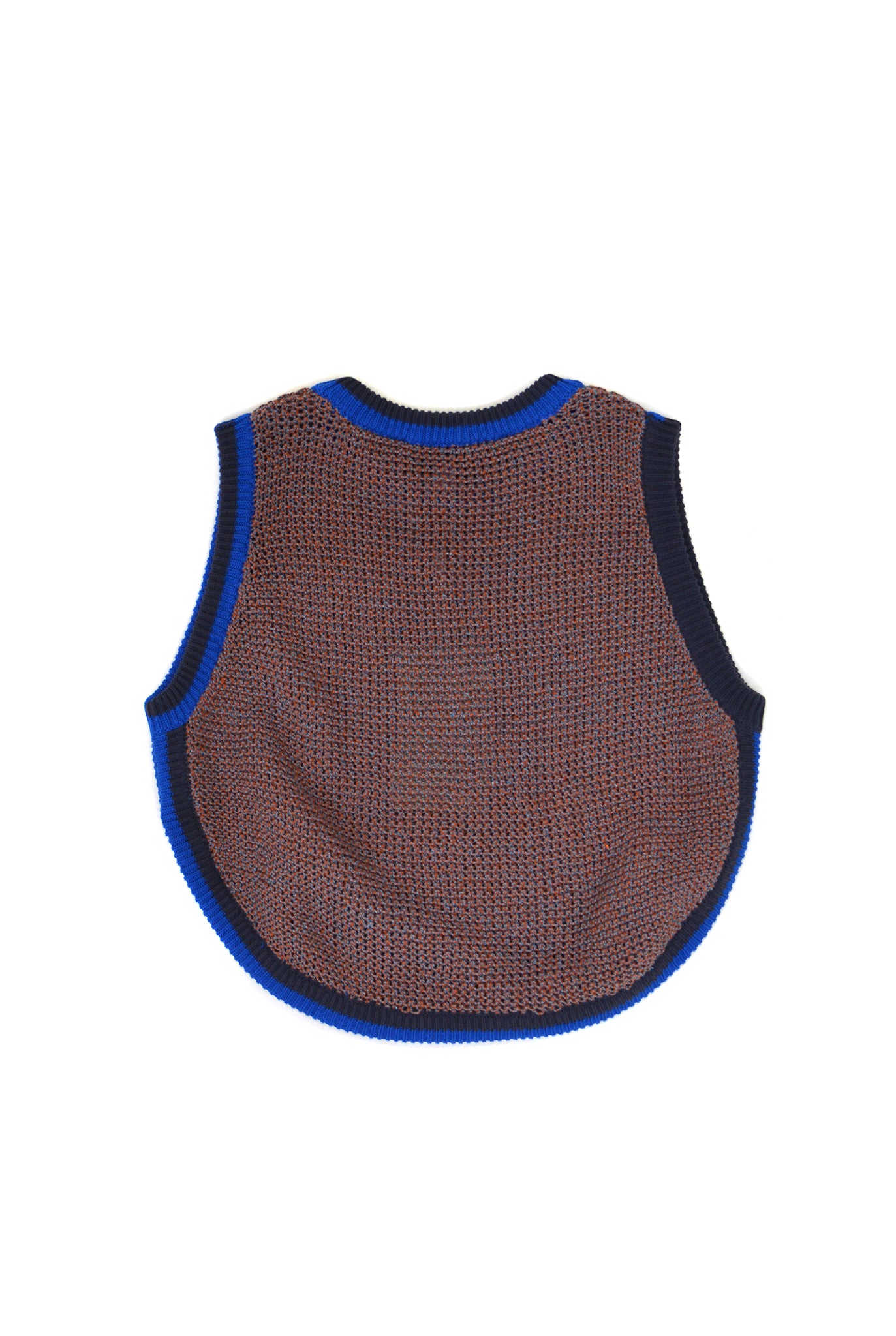 Sheer woven cropped tank top in shades of blues, greys and rust.