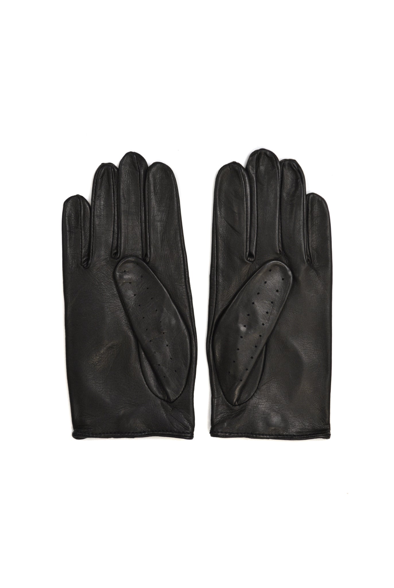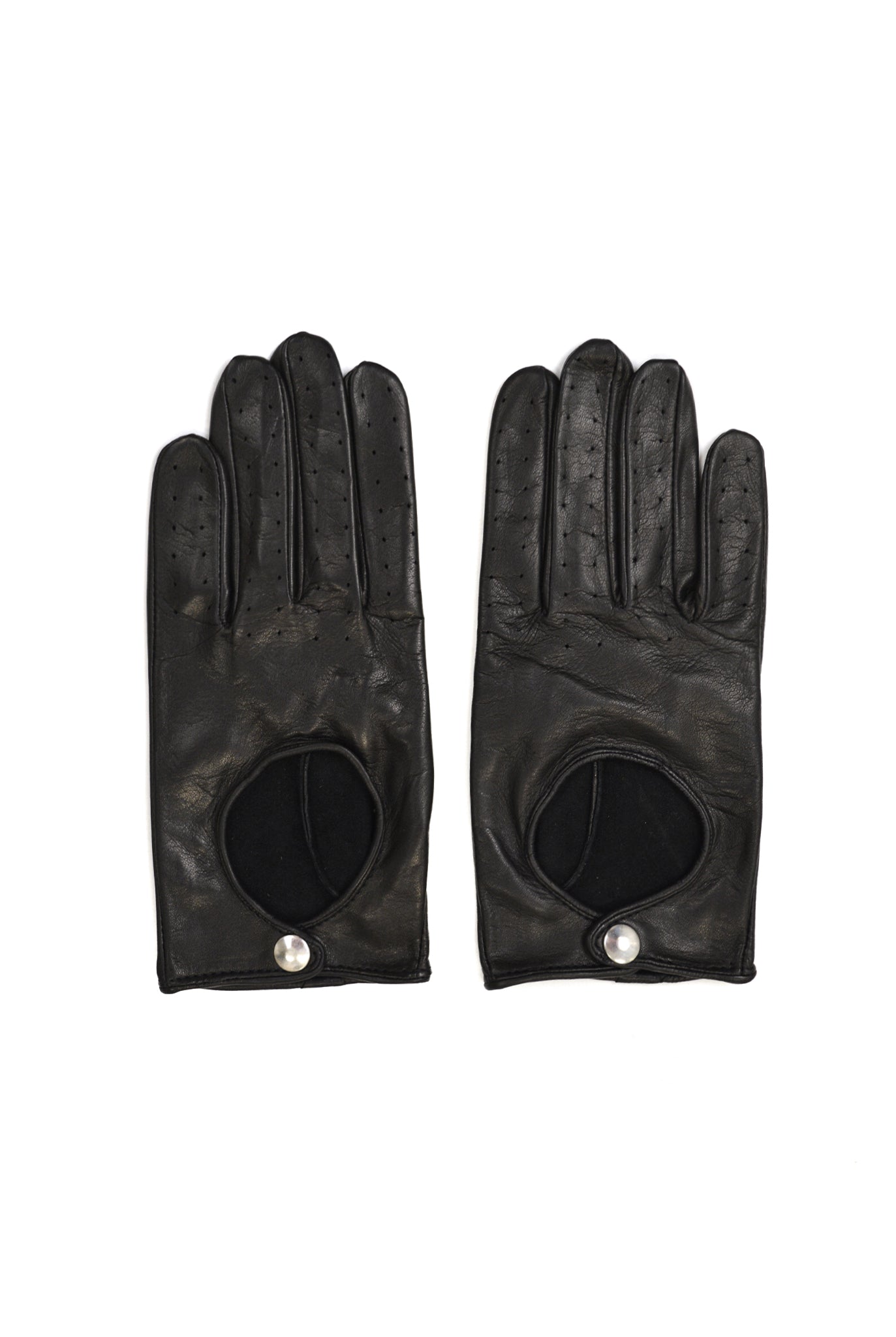 Buffed leather driving gloves in black. A snap detail accents the wrist.