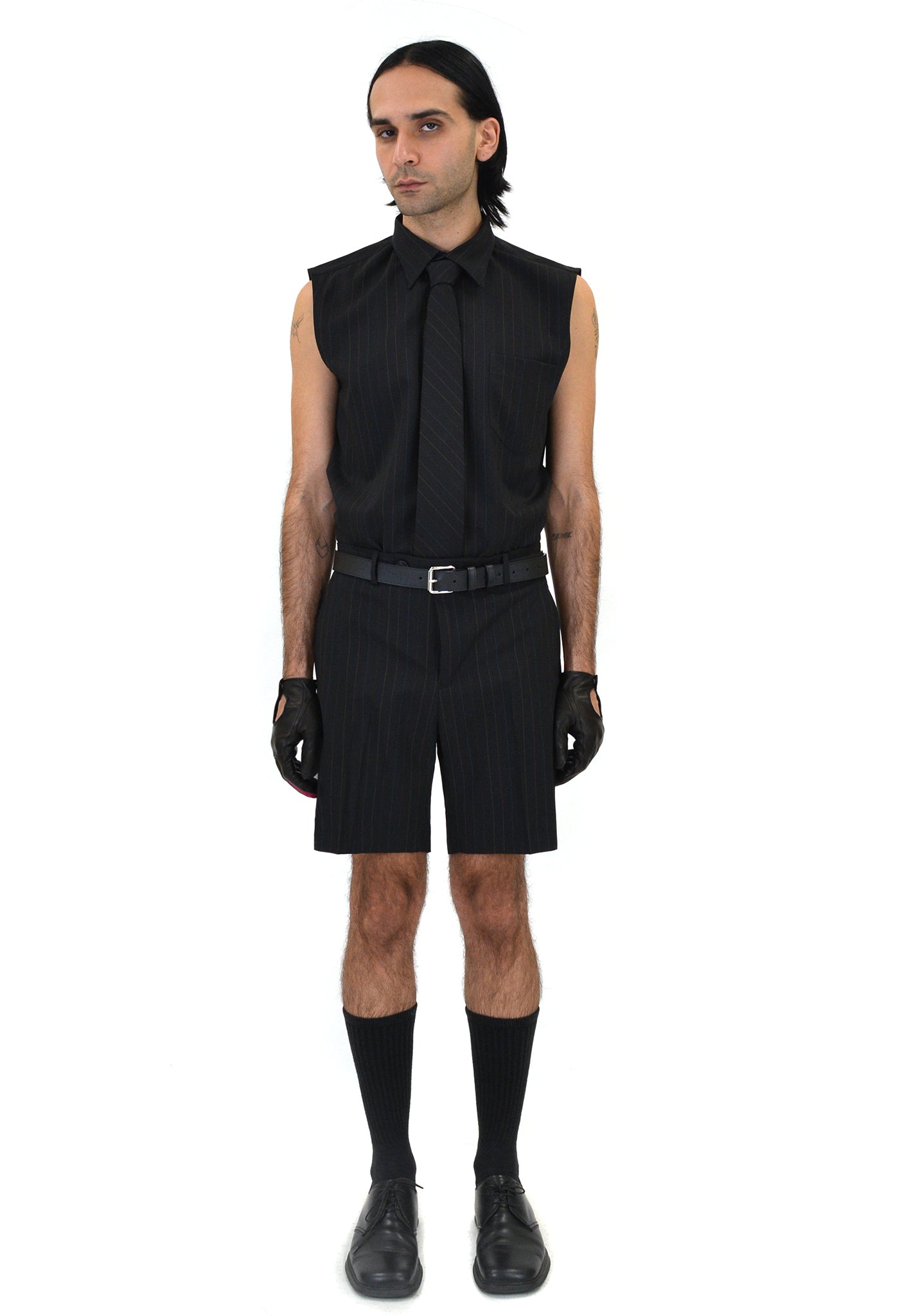 - Nima wears Ernest W. Baker pinstripe shirt, tie and trouser shorts