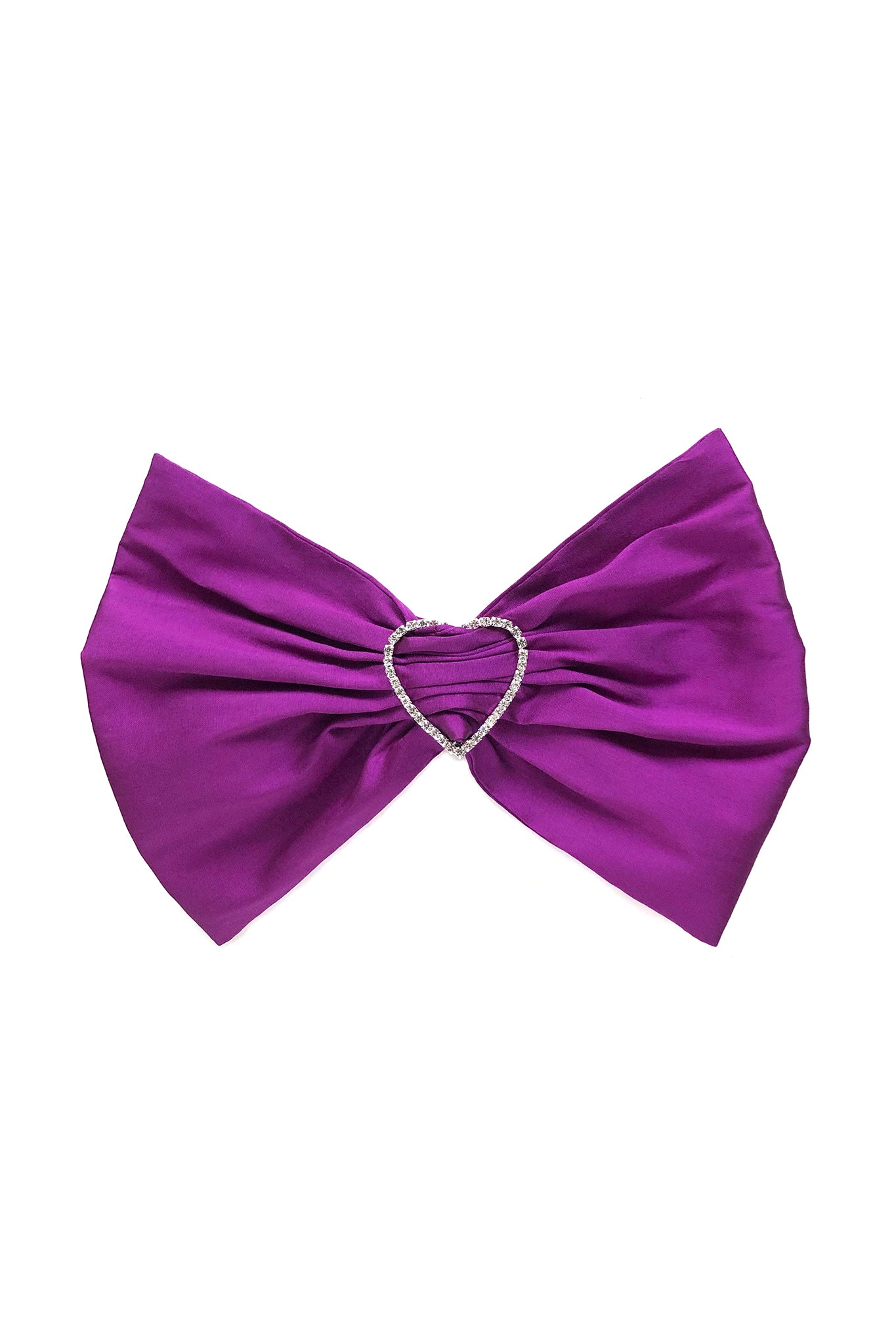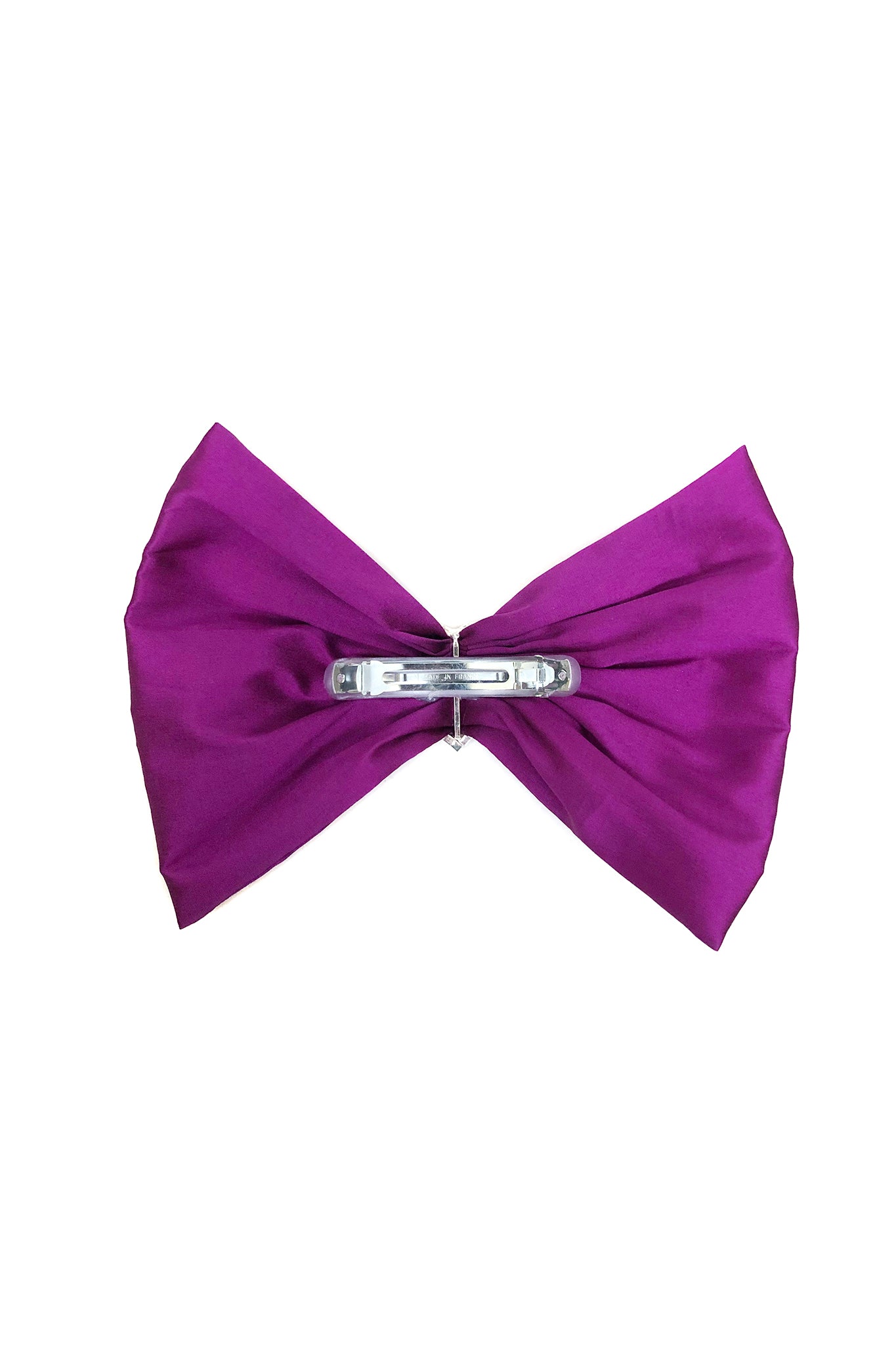 Extra large sparking purple hair bow affixed to a French barrette. A rhinestone-encrusted heart is at the centre of each bow.
