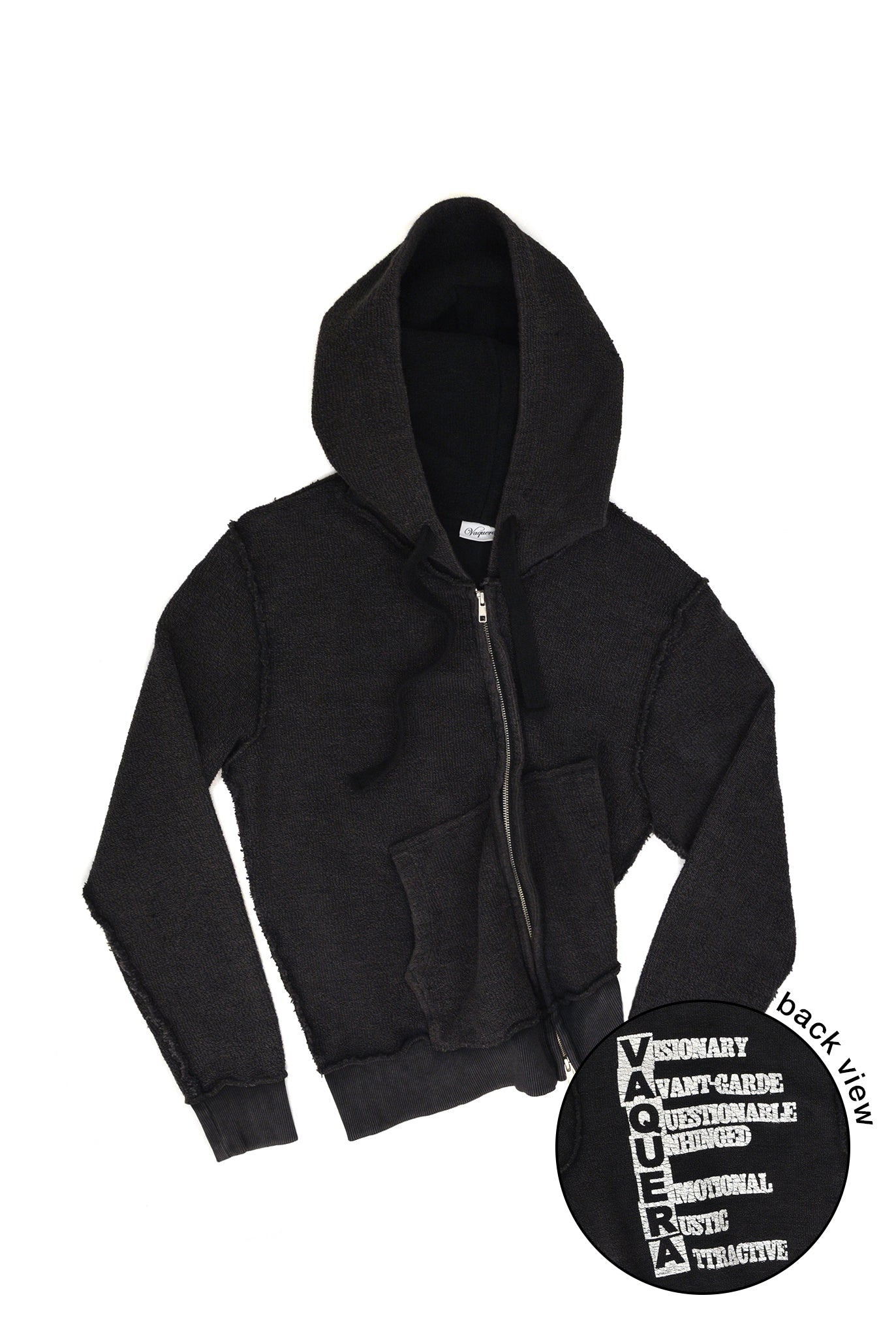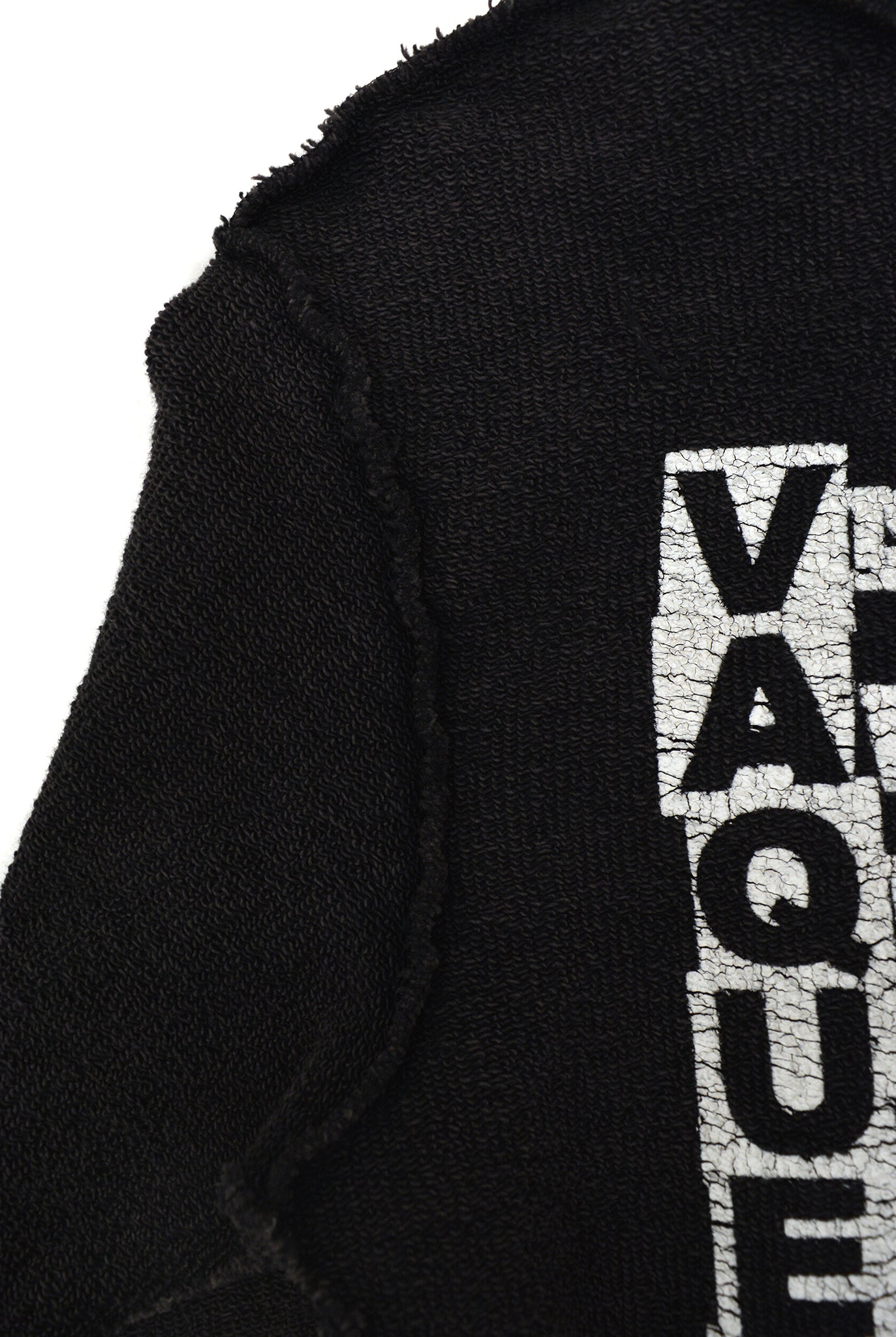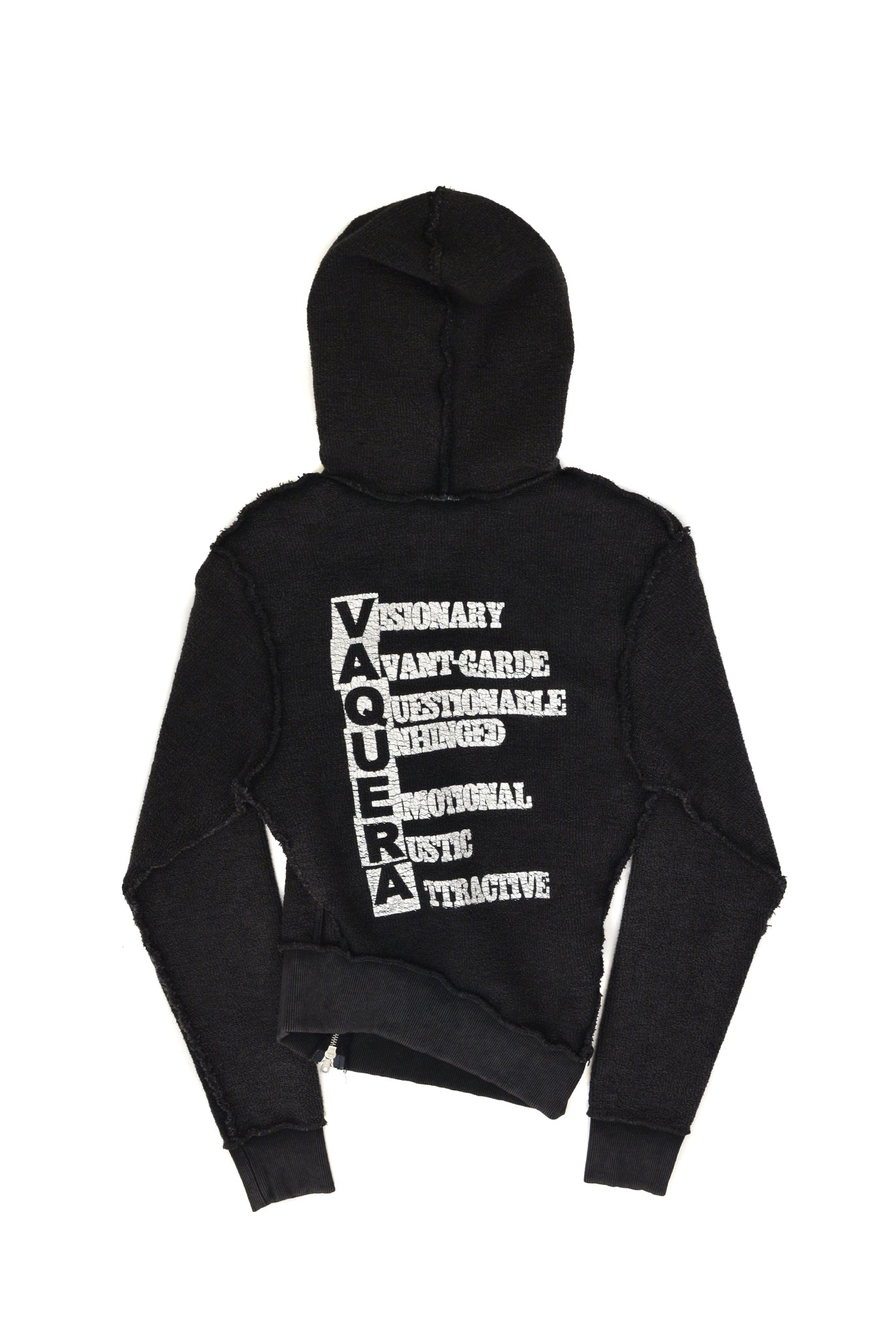 Vaquera's signature twisted hoodie has an intentionally warped, asymmetric fit that cinches the waist. This version has been sewn and printed on its inverse, exposing the loop-back fabric. Raw edges and fabric flubs are intentional.