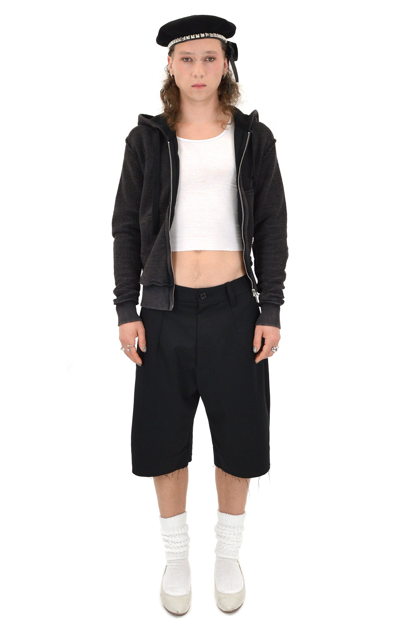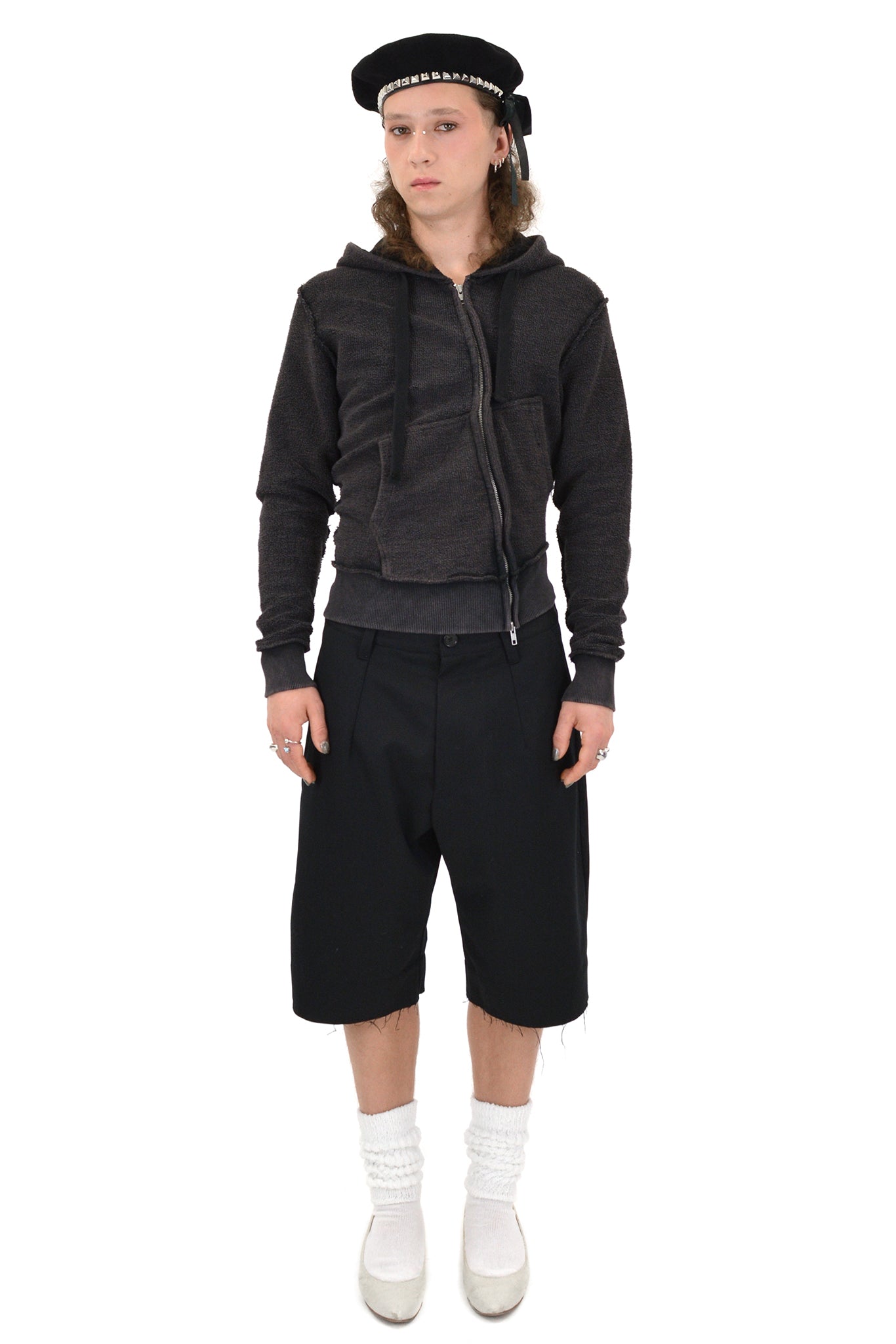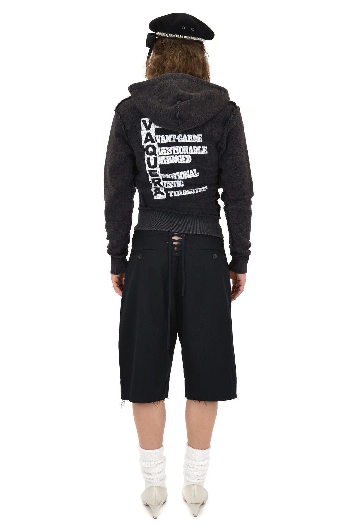 Vaquera's signature twisted hoodie has an intentionally warped, asymmetric fit that cinches the waist. This version has been sewn and printed on its inverse, exposing the loop-back fabric. Raw edges and fabric flubs are intentional.